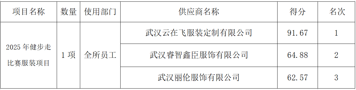 ? 武漢產(chǎn)品質(zhì)量檢驗(yàn)所有限公司工會(huì)小組于2025年1月24日上午,組織了“健步走比賽服裝采購項(xiàng)目”采購競爭性談判,結(jié)果公示如下: